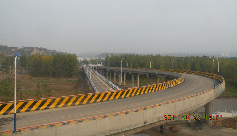 國(guó)電霍州發(fā)電廠跨汾河公路大橋東接國(guó)道108線(霍侯一級(jí)公路),西連電廠運(yùn)煤公路,東接口處南有霍州礦務(wù)局木材加工廠,北有個(gè)體汽車修理廠,居民較少。向西跨越汾河進(jìn)入電廠廠區(qū)后要上跨電廠主要出入道路。橋梁分左、右幅:左幅主要承擔(dān)電廠職工的生產(chǎn)、生活用車通行;右幅主要承擔(dān)電廠運(yùn)煤、運(yùn)渣等車輛通行。終點(diǎn)要與國(guó)道108線(霍侯一級(jí)公路)相連接,接點(diǎn)位置位于國(guó)道108線K826+160處。
