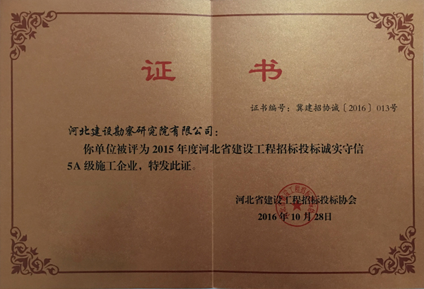 近日,公司被河北省建設(shè)工程招標(biāo)投標(biāo)協(xié)會評為2015年度河北省建設(shè)工程招標(biāo)投標(biāo)誠實守信5A級施工企業(yè)單位。