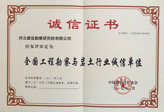 根據(jù)中國(guó)勘察設(shè)計(jì)協(xié)會(huì)5月15日發(fā)布的中設(shè)協(xié)字[2017]29號(hào)文件《關(guān)于公布工程勘察與巖土行業(yè)第一批第二批“誠(chéng)信單位”復(fù)評(píng)、復(fù)審結(jié)果的通知》,我公司作為第一批271家“誠(chéng)信單位”之一,通過復(fù)評(píng)審核,被審定為全國(guó)工程勘察與巖土行業(yè)誠(chéng)信單位,并于近日領(lǐng)取了誠(chéng)信證書。