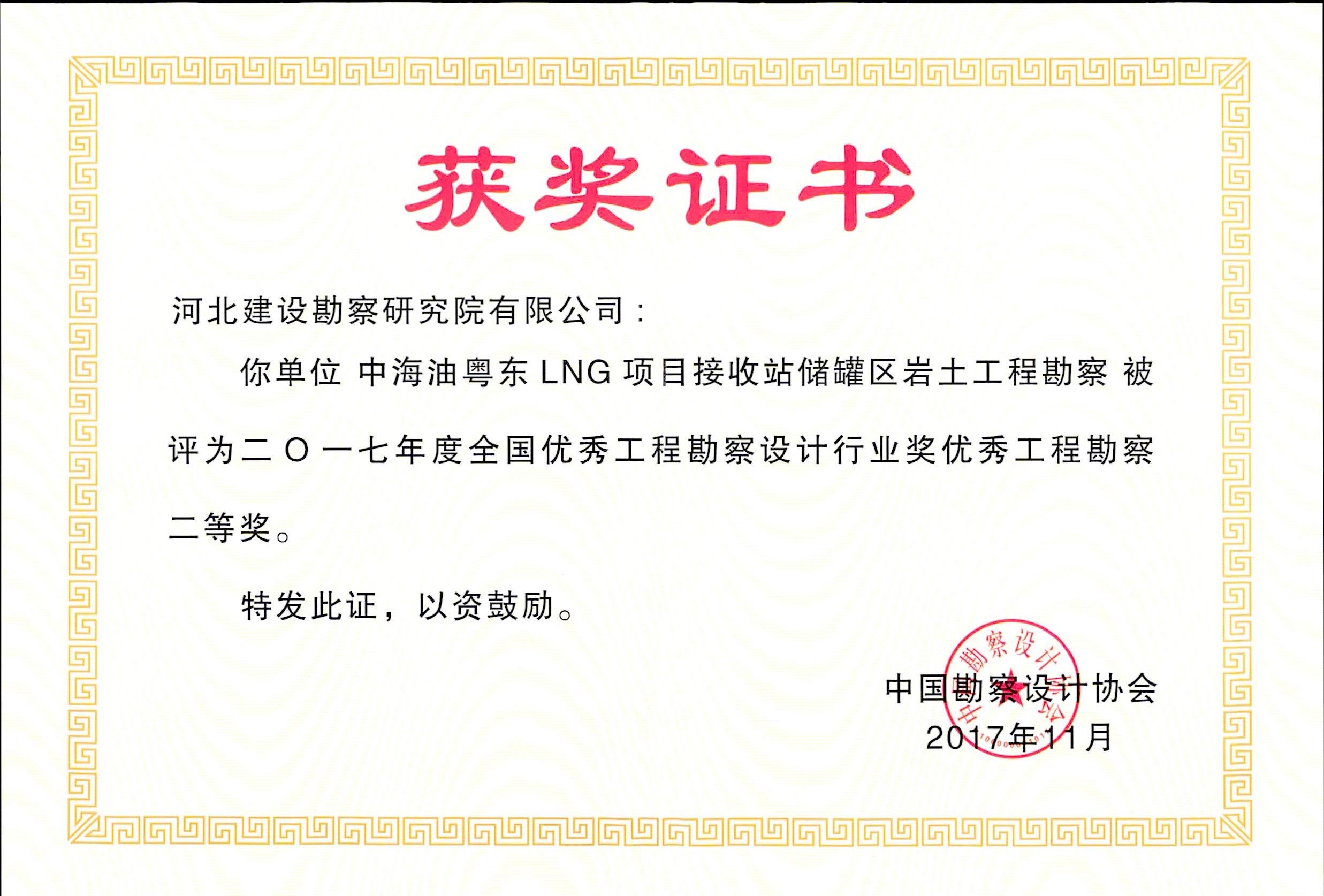 根據(jù)中國勘察設(shè)計協(xié)會2017年11月29日發(fā)布的中設(shè)協(xié)字【2017】85號文件《關(guān)于公布2017年度全國優(yōu)秀工程勘察設(shè)計行業(yè)獎評選結(jié)果的通知》,我公司兩項工程獲優(yōu)秀工程勘察獎。其中,山東東岳能源交口肥美鋁業(yè)有限公司1#赤泥堆場勘察與加固治理工程榮獲優(yōu)秀工程勘察一等獎,中海油粵東LNG項目接收站儲罐區(qū)巖土工程勘察榮獲優(yōu)秀工程勘察二等獎。
