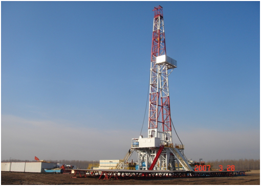 該型頁巖氣鉆機(jī),包括底座、井架、動力裝置、傳動機(jī)構(gòu)、聯(lián)動機(jī)構(gòu)、轉(zhuǎn)盤、絞車、游車、高壓管路、泥漿泵以及氣控系統(tǒng)。其優(yōu)點在于:通過采用密閉水冷式絞車,滾筒摩擦轂冷卻采用離心泵強(qiáng)制循環(huán)水冷卻方式,主滾筒摩擦轂上帶有水套和水循環(huán)管線;動力裝置采用三臺柴油發(fā)動機(jī),同時三臺柴油發(fā)動機(jī)之間設(shè)置聯(lián)動機(jī)構(gòu),增大功率;配備兩臺3NB 1300C泥漿泵,能滿足噴射鉆井的需要。
