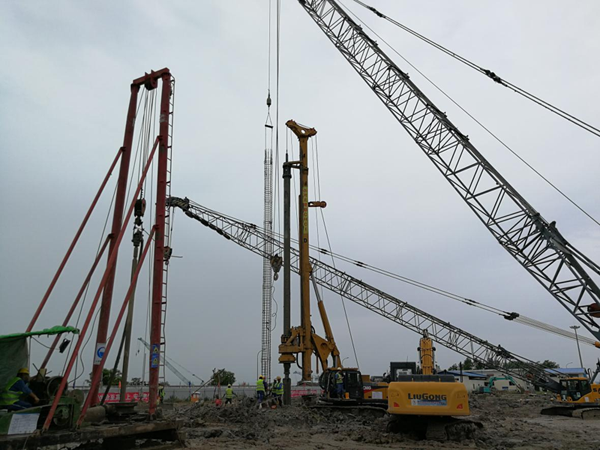 本項(xiàng)目施工高峰期投入150旋挖鉆機(jī)3臺,GPS-10回轉(zhuǎn)鉆機(jī)5臺,中方施工人員49人,緬方施工人員150人。本工程于2018年3月10日開工,9月02日竣工,共計(jì)177天,完成9個(gè)罐,直徑600mm樁基1250根,理論方量10650m³。整個(gè)施工期正值緬甸雨季,我公司克服種種施工困難,最終安全順利完成了總包方各個(gè)節(jié)點(diǎn)工期目標(biāo)。