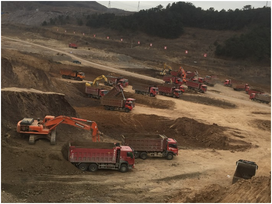由于本工程所處地質(zhì)條件的特殊性,施工過(guò)程中爆破工作量很大,同時(shí)由于山路陡峭崎嶇,給排土場(chǎng)道路的施工帶來(lái)了很大難度。施工過(guò)程中,我單位秉持精心安排、用心服務(wù)的管理理念,開(kāi)挖過(guò)程中合理劃分施工區(qū)域,根據(jù)不同地塊的石方開(kāi)挖高度采取合理的鉆爆施工方案,既避免了交叉作業(yè)帶來(lái)的安全問(wèn)題同時(shí)也提高了施工效率。