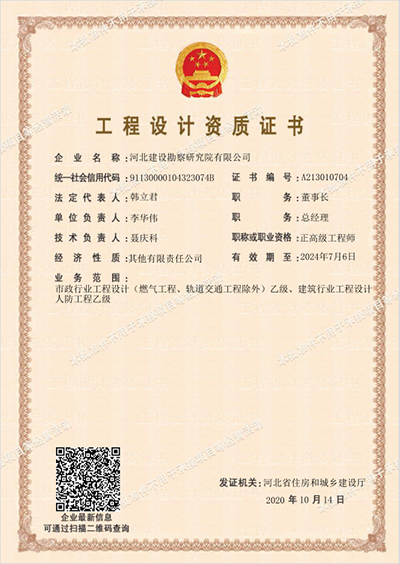 公司于2020年10月27日取得了建筑行業(yè)(人防工程)工程設(shè)計乙級資質(zhì)證書,可承擔(dān)(1)建設(shè)規(guī)模在1000萬元以下的各級人防工程設(shè)計項目;(2)建設(shè)規(guī)模在2000萬元以下的醫(yī)療救護(hù)工程、防空專業(yè)隊工程、人員掩蔽工程、人防配套工程設(shè)計項目。