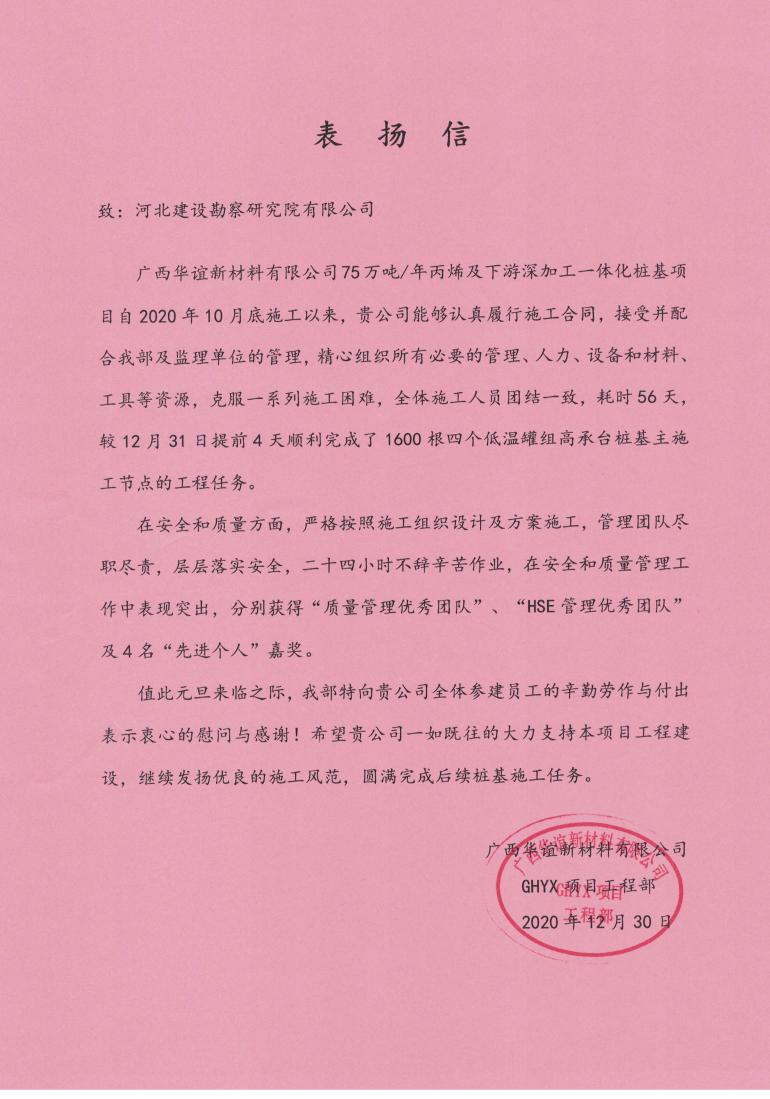廣西華誼新材料有限公司75萬噸/年丙烯及下游深加工一體化樁基項(xiàng)目部,近日收到來自甲方的表揚(yáng)信及嘉獎(jiǎng)。