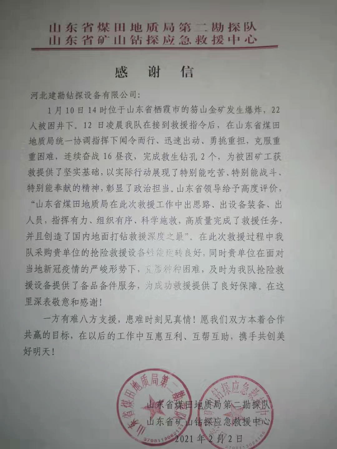 1月10日14時,位于山東省棲霞市的笏山金礦發(fā)生爆炸,22人被困井下。山東省煤田地質局第二勘探隊、山東省礦山鉆探應急救援中心連續(xù)奮戰(zhàn)16晝夜,完成救生鉆孔2個,為被困礦工獲救提供了堅實基礎,高質量完成了救援任務,并且創(chuàng)造了國內地面打鉆救援深度之最。在此次救援過程中,河北建勘鉆探設備公司提供的搶險救援設備性能運轉良好,并且在面對當?shù)匦鹿谝咔榈膰谰蝿菹?,克服種種困難,及時為救援隊搶險救援設備提供了備品備件服務,為成功救援提供了良好保障。為此,山東省煤田地質局第二勘探隊和山東省礦山鉆探應急救援中心在感謝信中深表敬意和感謝,并希望雙方本著合作共贏的目標,在以后的工作中互惠互利、互幫互助,攜手共創(chuàng)美好明天。