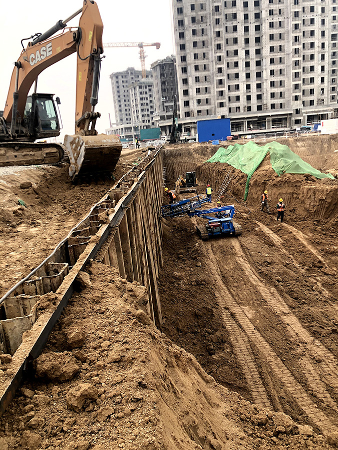 本工程位于雄安新區(qū),由中電建河北雄安智匯城建設(shè)發(fā)展有限公司投資建設(shè),我公司負(fù)責(zé)本項目基坑支護(hù)和樁基施工,共完成噴面約3290m²、土釘約5580m、錨索約6580m、鋼腰梁約2620m、鋼板樁打拔約4600m、擋水墻約212m;鉆孔灌注樁共完成420余根,其中直徑0.6m工程樁完成50余根,直徑0.8m工程樁完成370余根;
