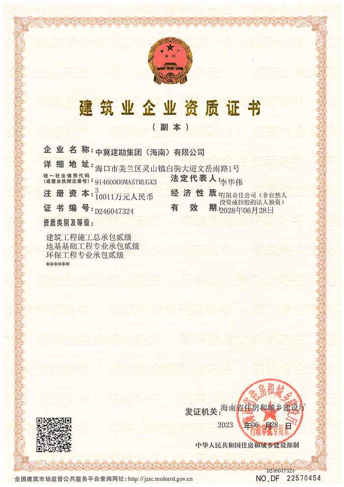 在集團(tuán)公司領(lǐng)導(dǎo)的運(yùn)籌帷幄下,2023年6月28日海南省住建廳通過了中冀建勘集團(tuán)(海南)有限公司建筑業(yè)企業(yè)資質(zhì)升級申請,順利取得建筑工程施工總承包貳級、地基基礎(chǔ)工程專業(yè)承包貳級和環(huán)保工程專業(yè)承包貳級資質(zhì)。